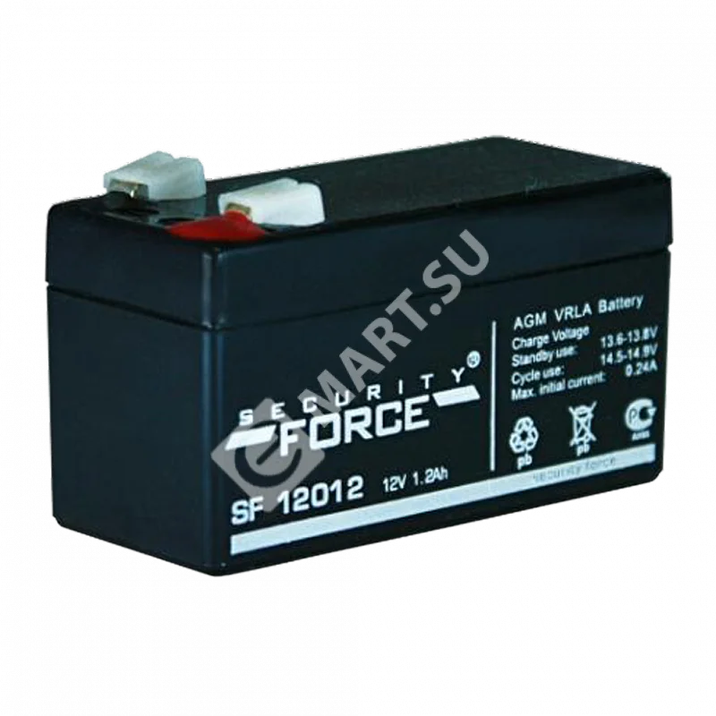 Аккумулятор SF 12012, Security Force, стационарный свинцово-кислотный, Емкость аккумулятора: 1,2 Ач, Номинальное напряжение: 12 В, Хранение: -20...+50°C, Заряд: -10...+50°C, Разряд: -15...+50°C, Размеры: 97х43х58 мм