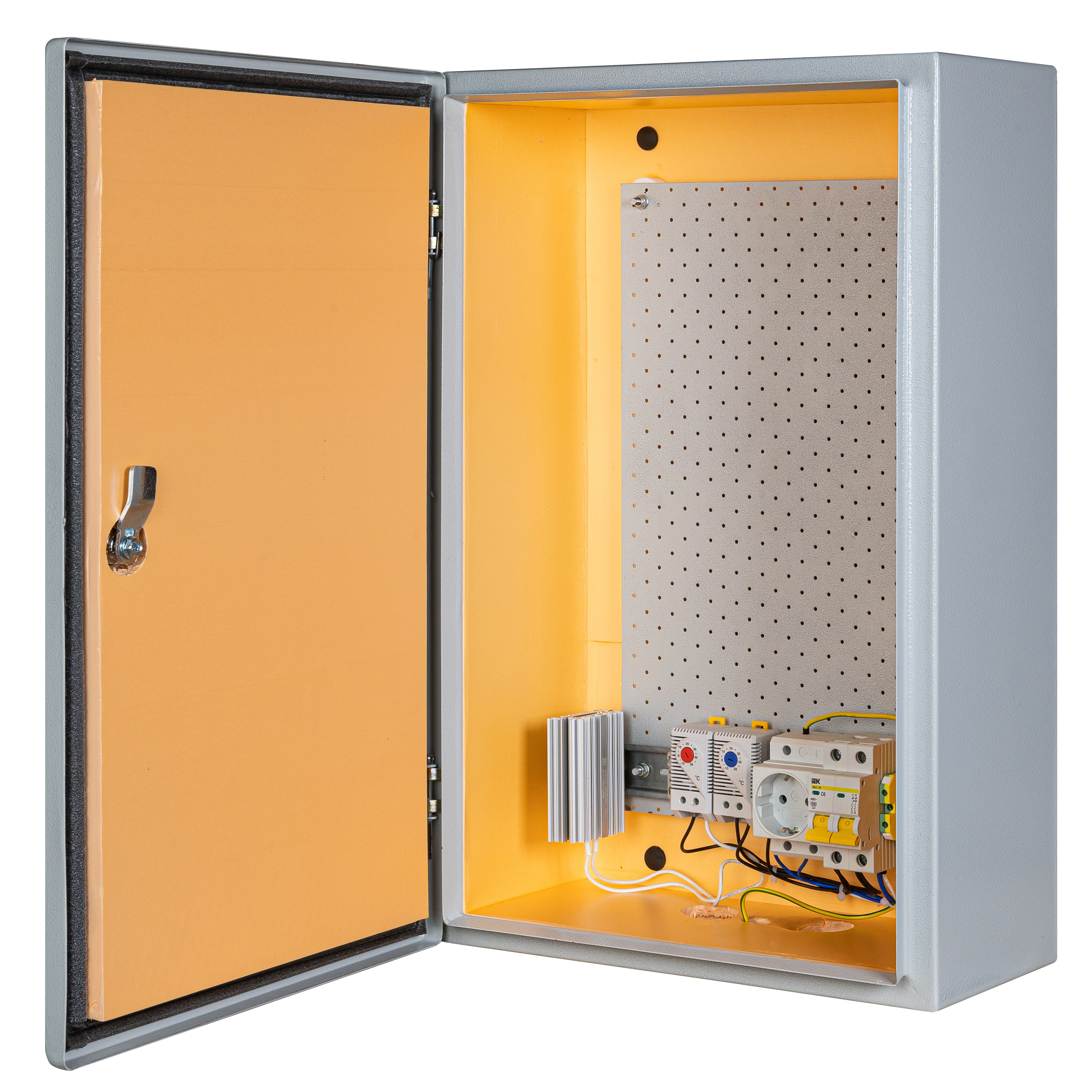 утеплитель из пенополистирола толщиной 20 мм, замок 1 шт, ключ 1 шт, монтажная плата 1шт, гермовводы 2шт, розетка 1 шт, автоматический выключатель 1шт, термореле 1шт., реле предстарта 1 шт., нагреватель мощностью в 50 Вт 1шт.