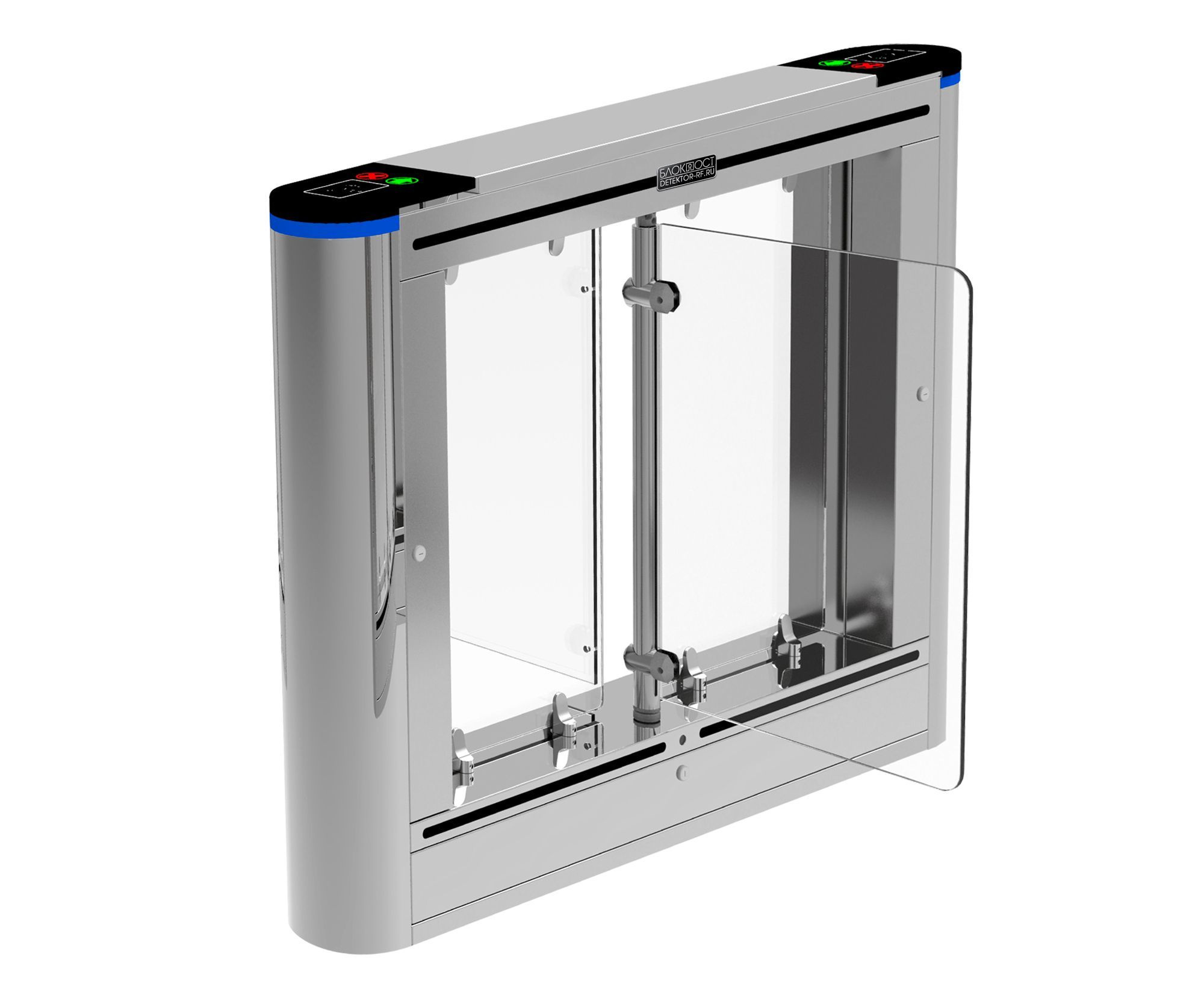 Блокпост РСП 1000 — это преграждающая конструкция, имеющая створки, которые закреплены на вертикальных валиках и могут распахиваться как в одну сторону, так и в другую. Распашной турникет оборудован функцией «Антипаника». Эта функция автоматически освобождает проход в экстренных случаях или при сбое электропитания, также она может быть активирована с пульта ДУ.