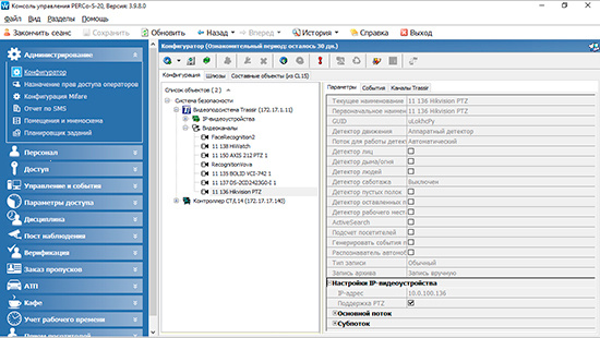 Вывод видео с камер Trassir в интерфейсе системы PERCo-S-20.