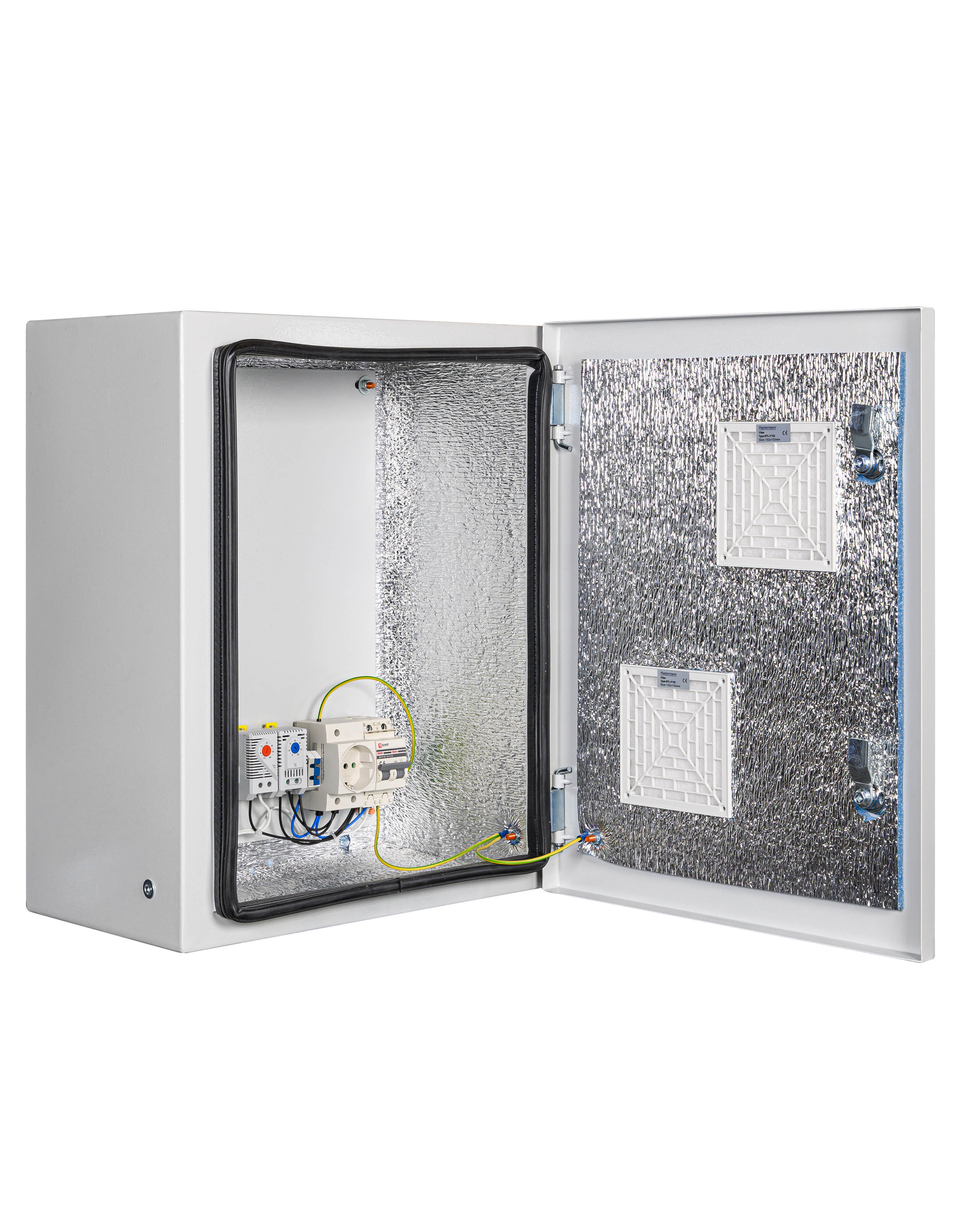 утеплитель из порилекса, замок 2 шт, ключ 1 шт, монтажная плата 1шт, гермовводы 2 шт (MG-25), розетка 1 шт, автоматический выключатель, 6А 1шт, клемма для подключения оборудования 2 шт, клемма заземления 1 шт, термореле 1шт, реле предстарта 1 шт, вентиляционная решётка с фильтром 2 шт, нагреватель мощностью 100 Вт 1шт.