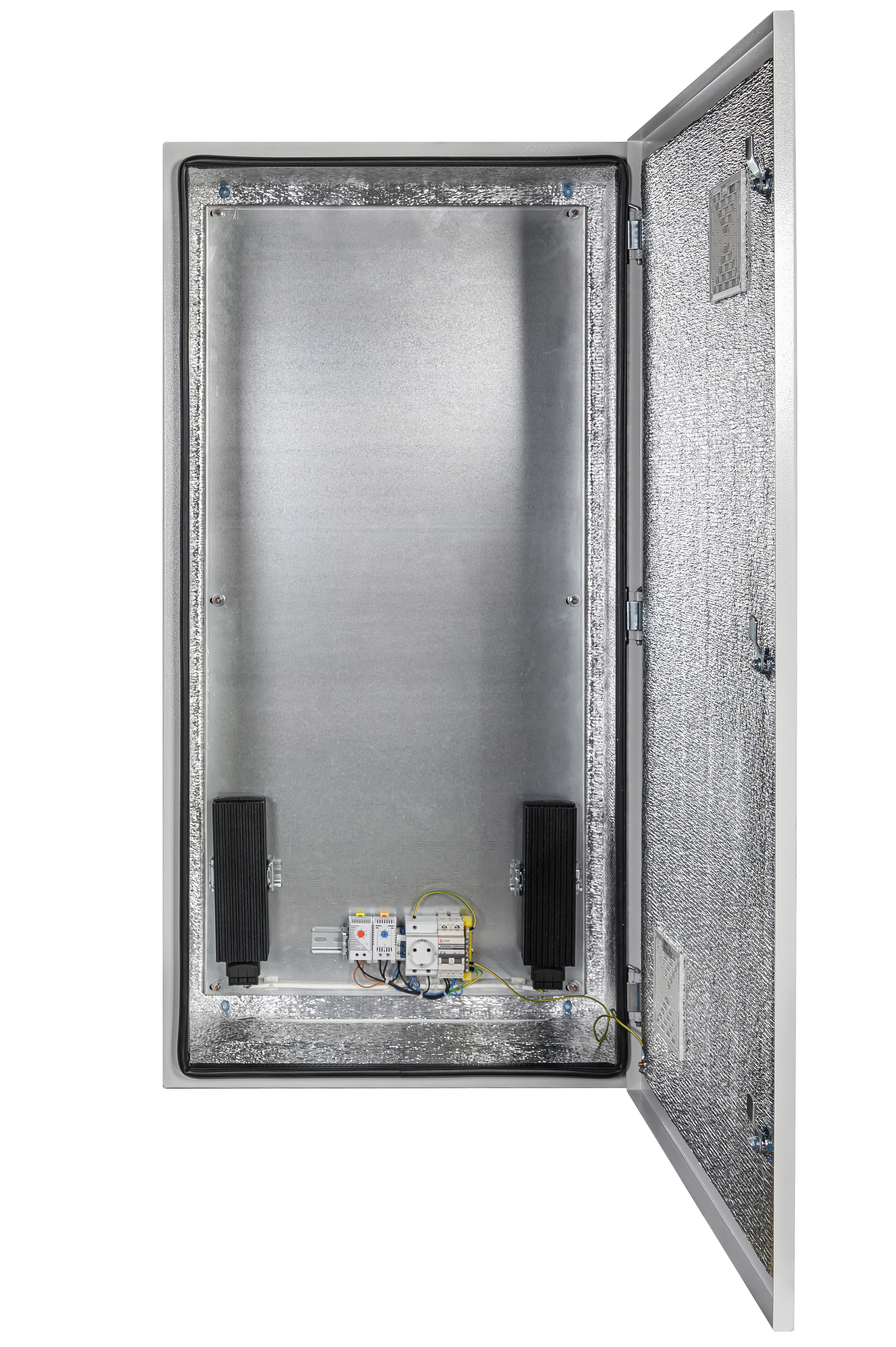 утеплитель из порилекса, замок 2 шт, ключ 1 шт, монтажная плата 1шт, гермовводы 5 шт (MG-25), розетка 1 шт, автоматический выключатель, 6А 1шт, клемма для подключения оборудования 2 шт, клемма заземления 1 шт, термореле 1шт, реле предстарта 1 шт, вентиляционная решётка с фильтром 2 шт, нагреватель мощностью 150 Вт 2 шт.