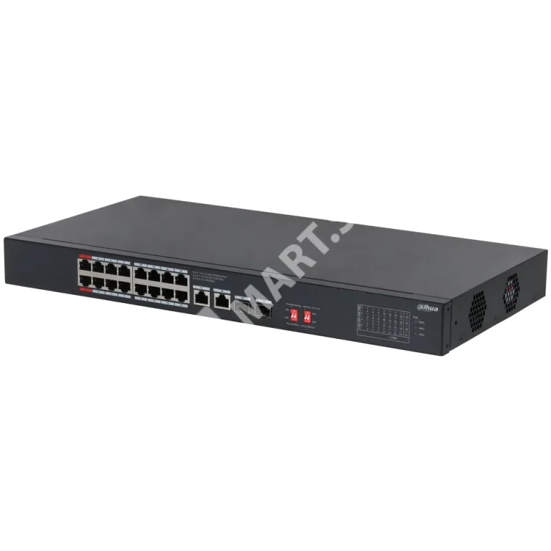 Порты: 16 RJ45 10/100/1000Мбит/с (PoE/PoE+/Hi-PoE), 2 RJ45 10/100/1000Мбит/с (uplink), 2 SFP 1000Мбит/с (uplink); мощность PoE: порты 1~2 до 90Вт, порты 3~16 до 30Вт, суммарно до 190Вт; PoE watchdog; питание: 100~240В(AC)