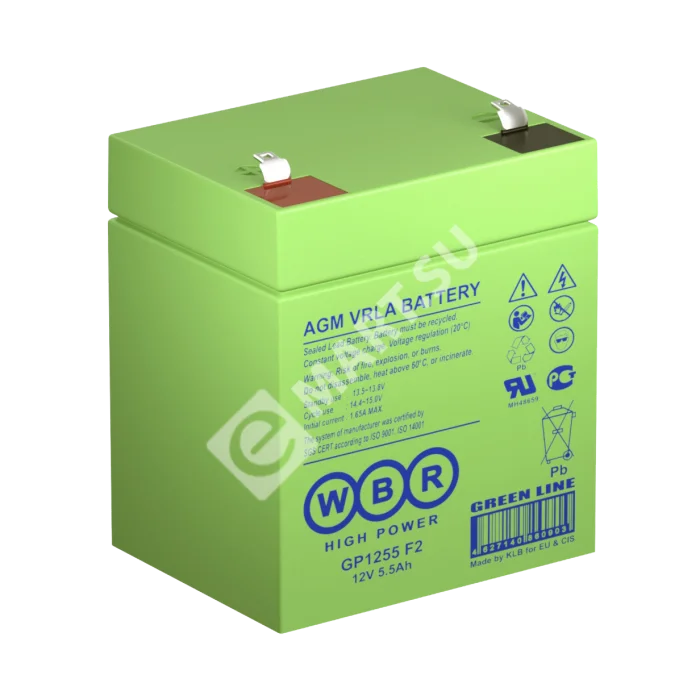 Аккумулятор WBR GP1255 F2 - герметизированная, выполненная по технологии AGM, батарея общего применения со сроком службы до 8 лет в буферном режиме или 260 циклов заряда-разряда в циклическом режиме при 100% разряде. Эта высокоэффективная, перезаряжаемая батарея, не требующая обслуживания в течение всего срока службы.