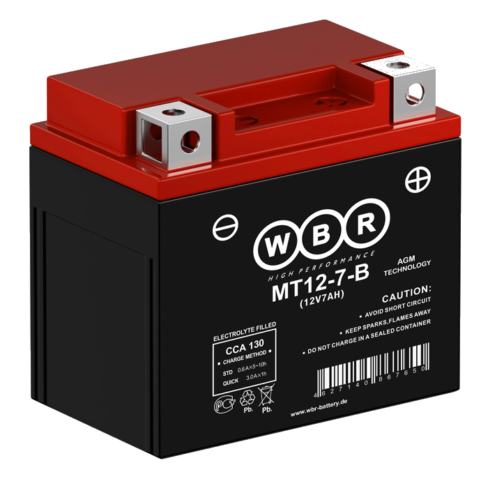Аккумулятор WBR МТ12-7-B - герметизированная, выполненная по технологии AGM, необслуживаемая (MF) стартерная мотоциклетная свинцово-кислотная аккумуляторная батарея. Обладает высоким качеством и надежностью. Она предназначена для запуска двигателя мотоциклов, скутеров, гидроциклов, квадроциклов, снегоходов и мотовездеходов.