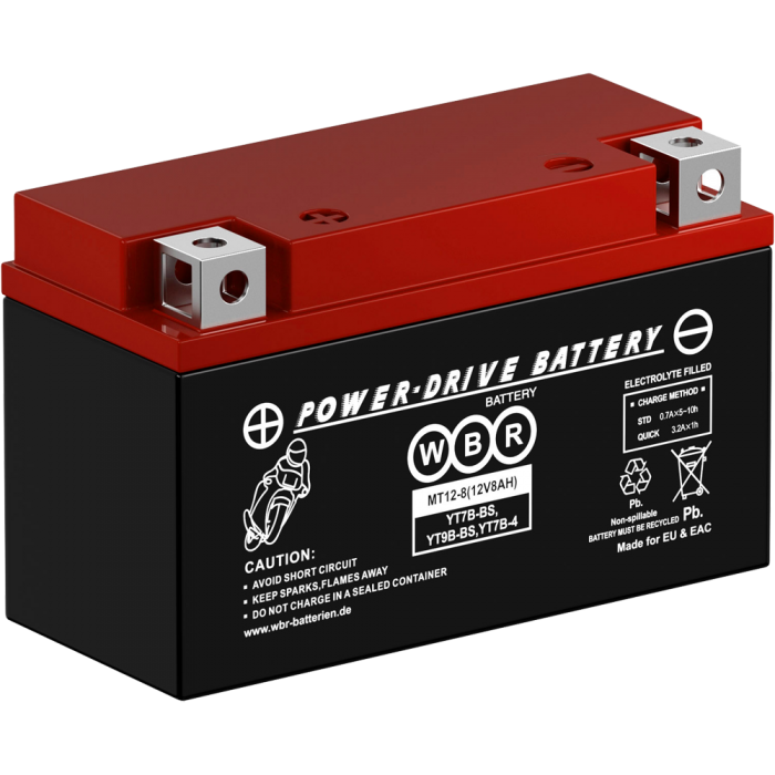 Аккумулятор WBR МТ12-8 - герметизированная, выполненная по технологии AGM, необслуживаемая (MF) стартерная мотоциклетная свинцово-кислотная аккумуляторная батарея. Обладает высоким качеством и надежностью. Она предназначена для запуска двигателя мотоциклов, скутеров, гидроциклов, квадроциклов, снегоходов и мотовездеходов. Батарея соответствует техническим характеристикам и является аналогом мотоциклетных аккумуляторных батарей YUASA моделей YT7B-BS и YT9B-BS.