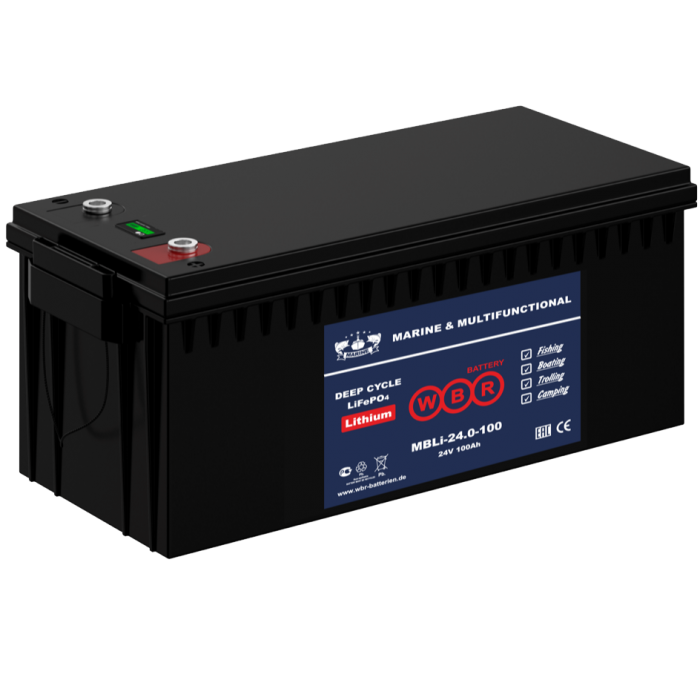 Аккумулятор WBR Marine серии MBLi24-100 - литиевая (литий железо фосфатные LiFePO4), герметизированная, лодочная аккумуляторная батарея. Обладает высоким качеством и надежностью, высокой цикличностью использования, устойчивы к глубоким разрядам и применяются для питания на яхтах, катерах и моторных лодках. Возможно применение как источников питания для электронасосов, эхолотов, осветительных приборов и другого вспомогательного оборудования. Обладают в 20 раз большей цикличностью и большим сроком службы, чем свинцово-кислотные аккумуляторы, что помогает минимизировать затраты на замену и снизить общую стоимость владения. Аккумулятор MBLi24-100 вдвое мощнее, имеет более высокую скорость разряда, сохраняя при этом высокую энергетическую емкость, на 60% легче аналогичной свинцово-кислотной батареи. Превосходная безопасность: химия фосфата лития железа исключает риск взрыва или горения из-за сильного удара, перезаряда или короткого замыкания.