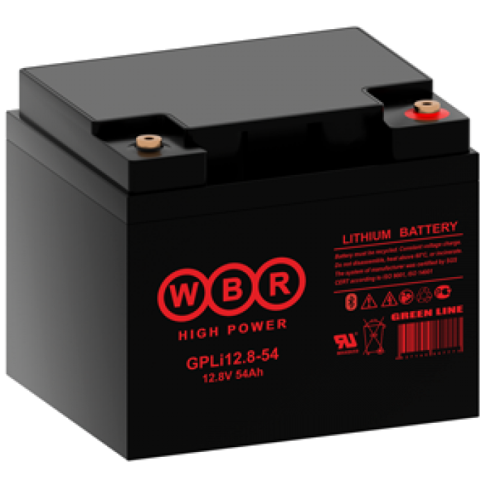 Аккумулятор WBR серии GPLi12.8-54 литий-железо-фосфатные (LiFePO4), обладающие высоким качеством и надежностью, увеличенной в 10 раз цикличностью использования и уменьшенным на 60% весом по сравнению со свинцово-кислотными аккумуляторными батареями. Современная технология производства аккумуляторов с использованием химического взаимодействия углерода и феррофосфата на основе литий-ионных аккумуляторов исключает риск воспламенения или взрыва при сильном ударе, перезаряде или коротком замыкании.
