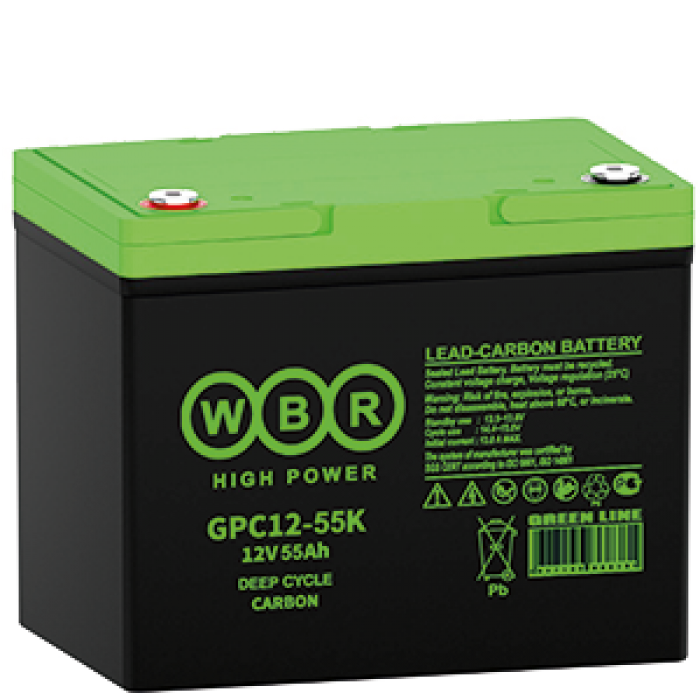 Аккумулятор WBR GPC12-55K - герметизированная, карбоновая, свинцово кислотная, аккумуляторная батарея со сроком службы 15 лет или более 1900 расчетных циклов заряда-разряда в циклическом режиме при 70% разряде. Эта высокоэффективная, перезаряжаемая батарея не требует обслуживания в течение всего срока службы и за счет использования чистого свинца, а также добавки углерода в состав электродов получили улучшенные зарядные и разрядные характеристики.
