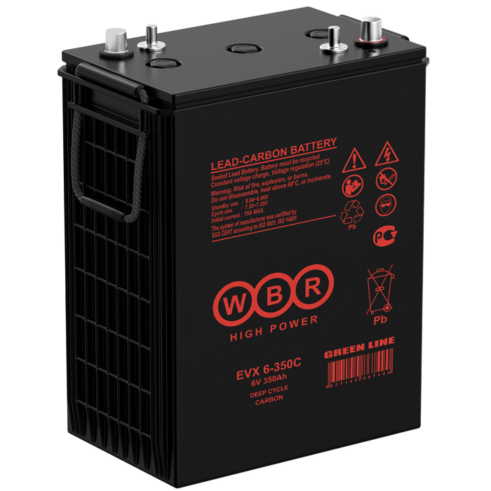 Аккумулятор WBR EVX6-350C - герметизированная, выполненная по технологии AGM, карбоновая свинцово-кислотная аккумуляторная батарея. Обладает высоким качеством и надежностью, устойчивы к глубоким разрядам и применяются для питания электрических транспортных средств, гольфкаров, газонокосилок, полотерных и поломоечных машин, медицинских колясок и другой техники.