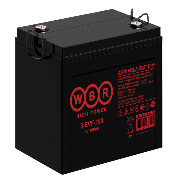 Аккумулятор WBR 3-EVF-180 - герметизированные выполненные по AGM-технологии свинцово-кислотные аккумуляторные батареи WBR серии EVF обладают высоким качеством и надежностью, устойчивы к глубоким разрядам. Применяются для источников бесперебойного питания, электрических транспортных средств, накопителей альтернативной энергетики и другого вспомогательного оборудования.