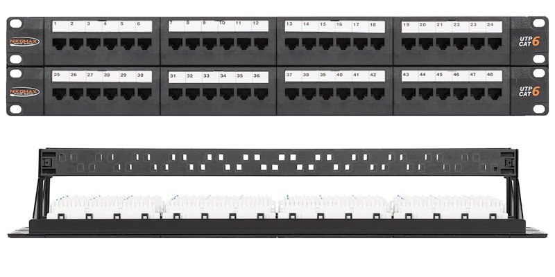 Коммутационная панель NIKOMAX 19", 2U, 48 портов, Кат.6 (Класс E), 250МГц, RJ45/8P8C, 110/KRONE, T568A/B, неэкранированная, с органайзерами, черная - гарантия: 5 лет расширенная / 25 лет системная