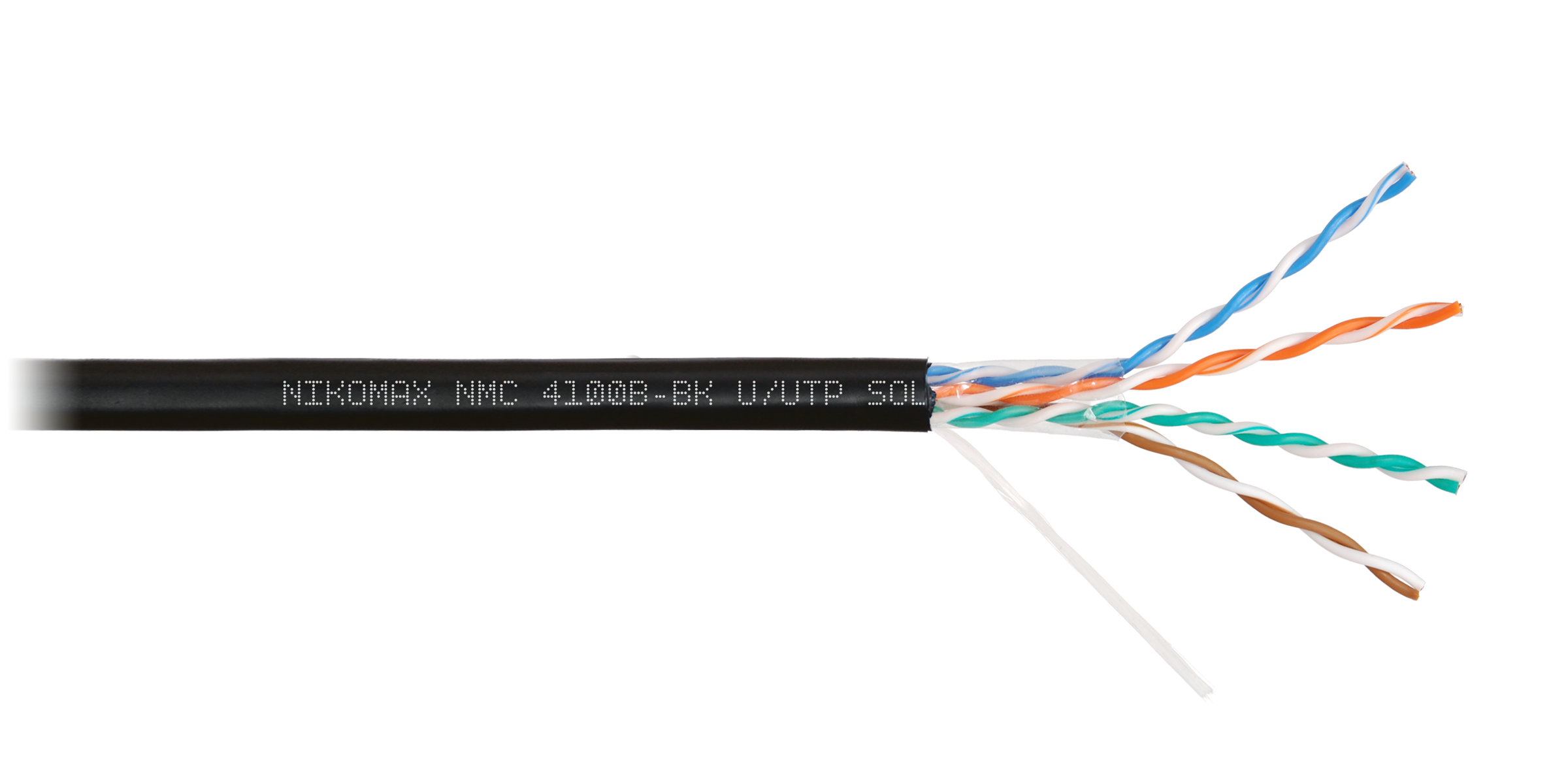 Кабель NIKOMAX U/UTP 4 пары, Кат.5e (Класс D), тест по ISO/IEC, 100МГц, одножильный, BC (чистая медь), 24AWG (0,51мм), полиэтилен, внешний, черный, 305м - гарантия: 3 года