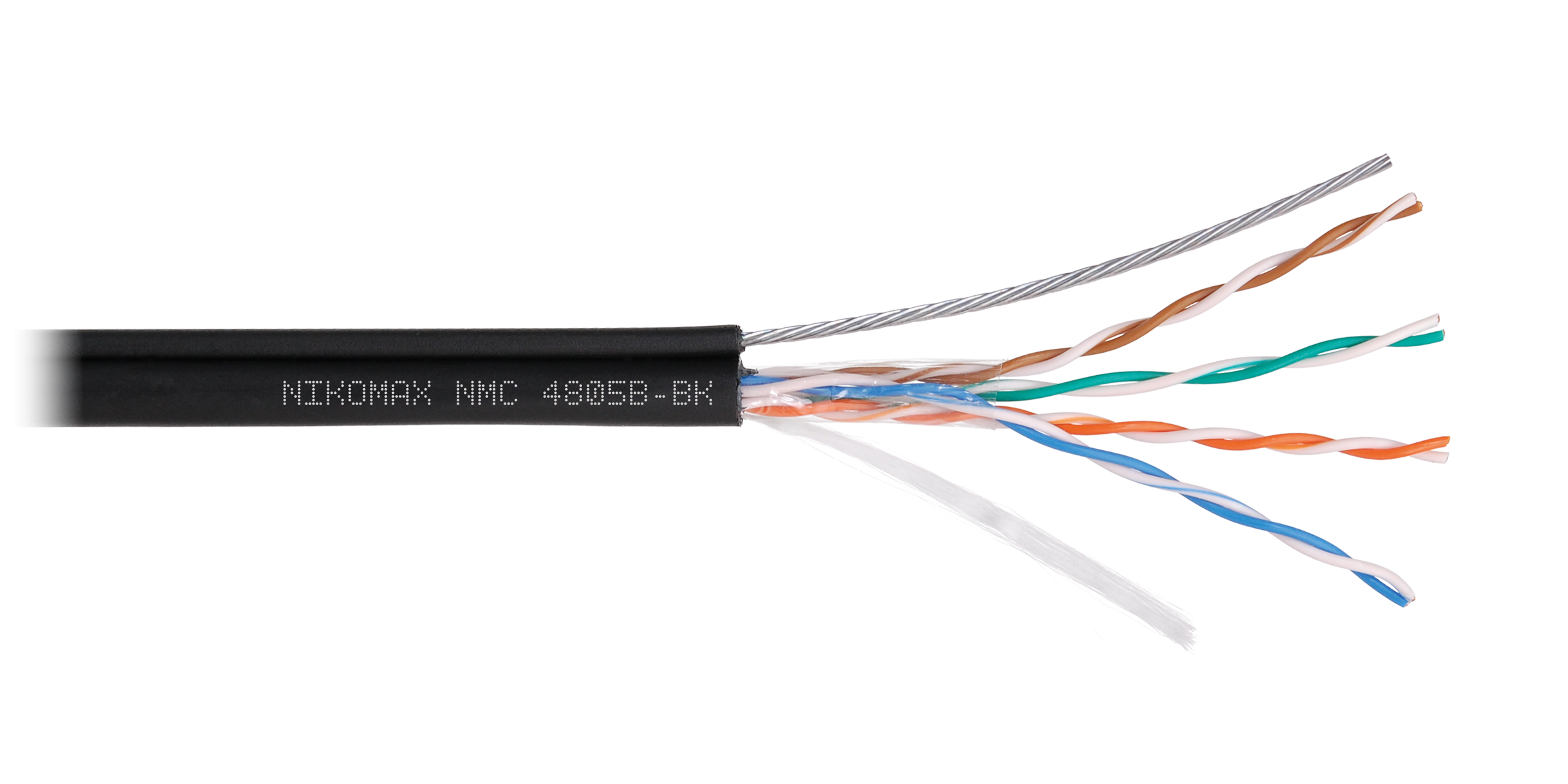 Кабель NIKOMAX U/UTP 4 пары, Кат.5e (Класс D), тест по ISO/IEC, 100МГц, одножильный, BC (чистая медь), 24AWG (0,51мм), полиэтилен, внешний, с многожильным тросом (1,25мм), черный, 500м - гарантия: 3 года