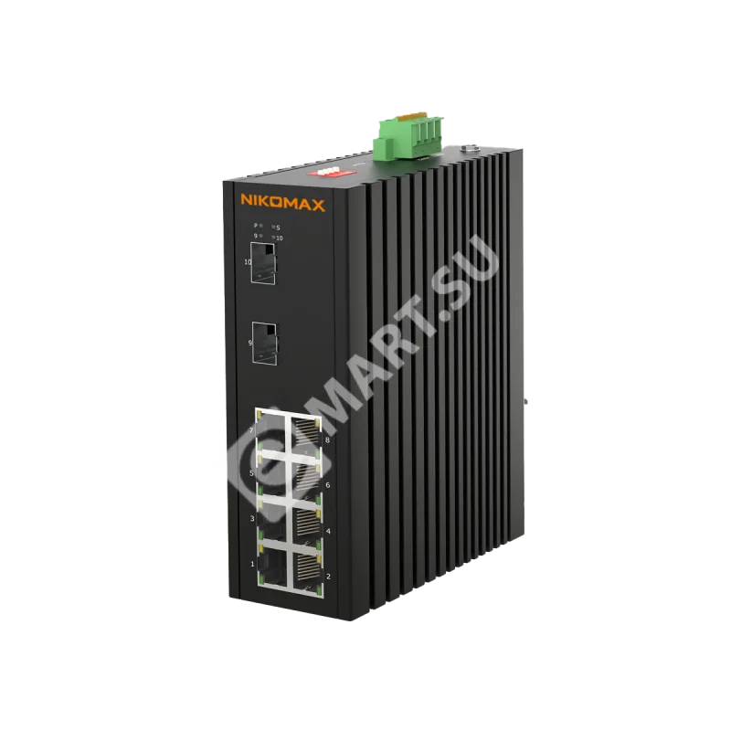 Неуправляемый промышленный коммутатор NIKOMAX, 8*10/100/1000Мбит/с PoE (af/at/BT) из которых 4 порта PoE BT, 2*1Гбит/с SFP, крепление на DIN-рейку, 2*ввода питания, питание 44-57В (блок питания 240Вт поставляется отдельно), -40С +75С.