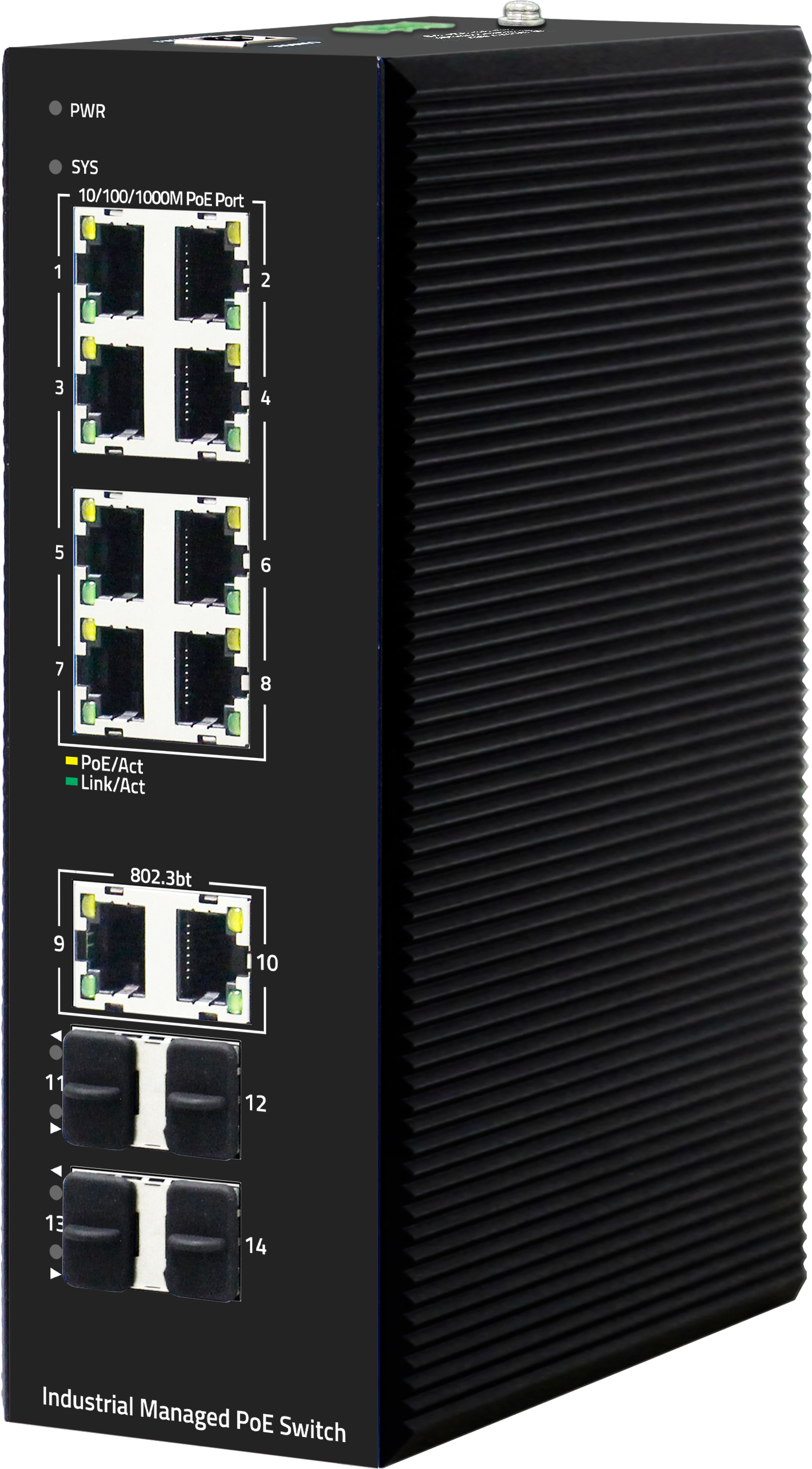 Управляемый промышленный L2 коммутатор NIKOMAX, 8*10/100/1000Мбит/с PoE (af/at), 2*10/100/1000Мбит/с PoE (BT), 2*1Гбит/с SFP, 2*2.5Гбит/с SFP, Крепление на DIN-рейку, 2*ввода питания, питание 12-55В (блок питания 420Вт поставляется отдельно), -40С +85С.