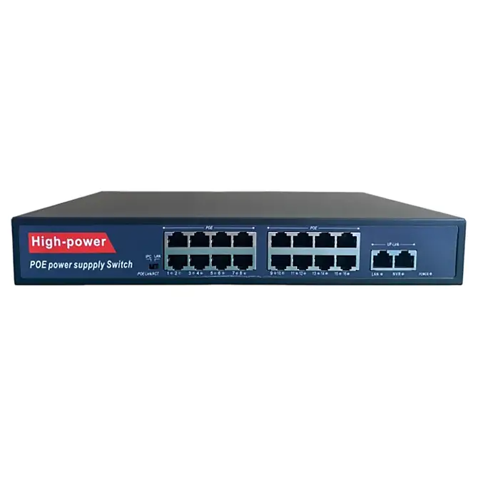 HN-POE216 – неуправляемый коммутатор на 18 портов, 16 из которых с поддержкой технологии POE стандарта 802.3af/at (Type A) 100 Мбит. Максимально поддерживаемая мощность подключаемых устройств составляет 30 Вт на каждый порт. Максимальная суммарная мощность всех подключенных устройств должна быть не больше чем 350 Вт. Дополнительно присутствуют 2 LAN порта с максимальной скоростью до 1000 Мбит. Дальность подключения устройств (POE+данные) составляет до 250 метров в режиме IPC (поток не более 10 мБит/с на 1 порт) или до 100 метров в обычном режиме.