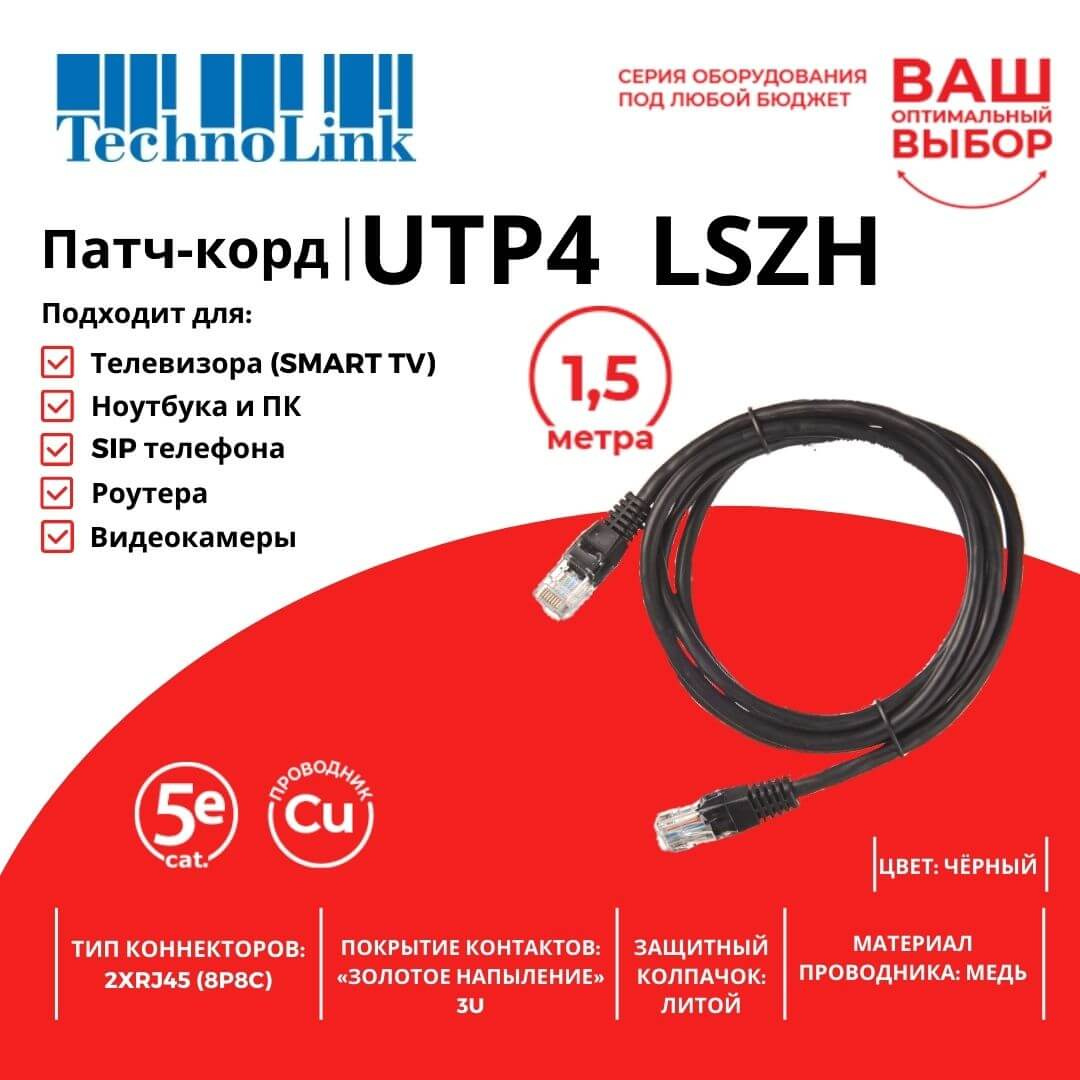 Патч-корд Technolink UTP4 cat 5e, 1,5м, ВС, LSZH, черный, литой коннектор