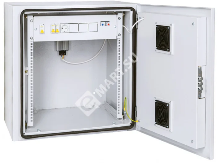 Шкаф предназначен для размещения телекоммуникационного, электротехнического, кроссового и иного оборудования выполненного в 19 - дюймовом стандарте.Шкаф изготовлен со степенью защиты по ГОСТ 4254-96 (МЭК 529-89) – IP54. В боковые стенки встроена система вентиляции, состоящая из вентилятора и фильтра. Шкаф крепится на стену при помощи 4-х анкеров, при необходимости можно применить крепление на столб (входит в комплект поставки).